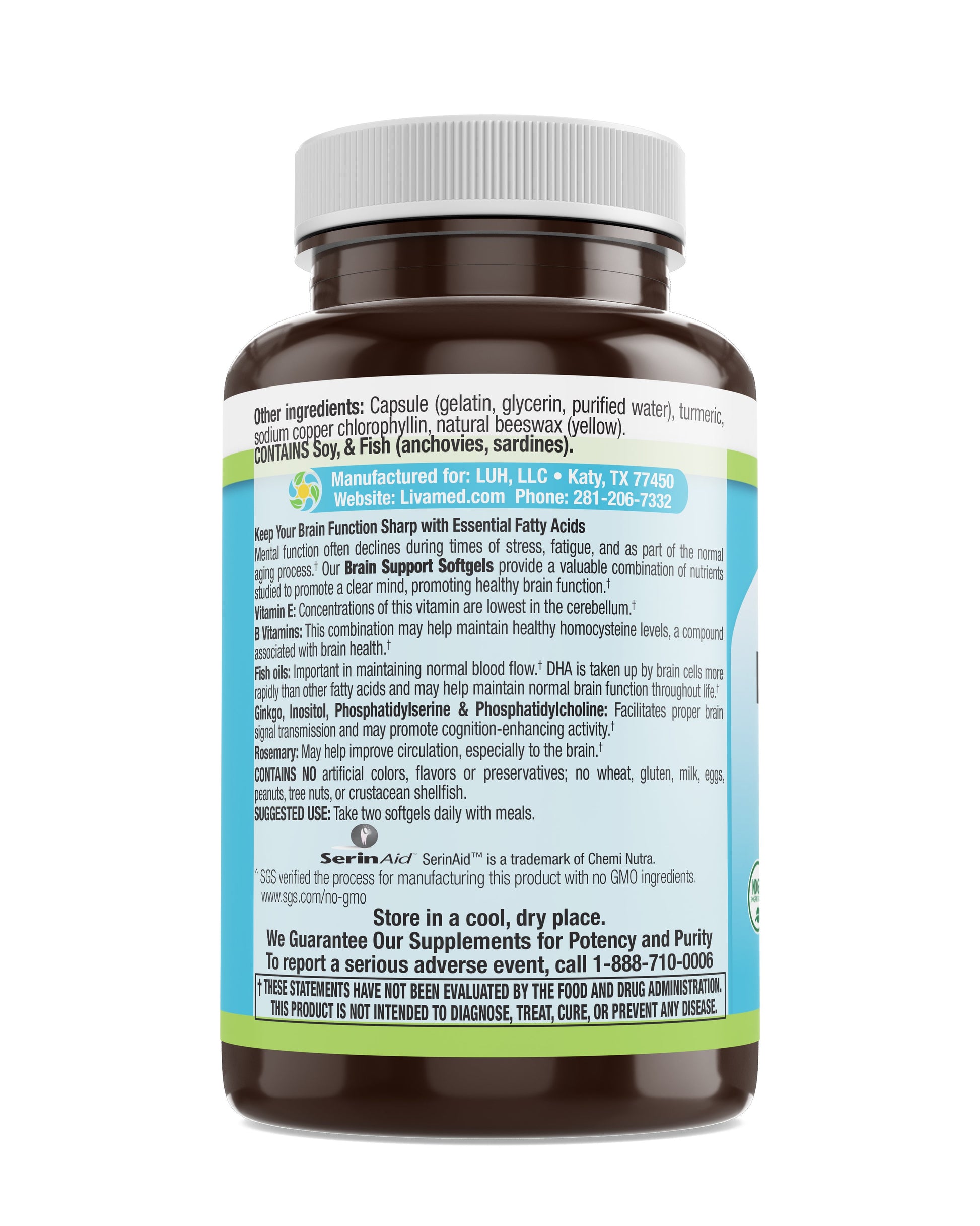 Supports brain health. Gluten free. We guarantee our supplements for potency and purity. Contains no artificial colors, flavors or preservatives; no wheat, gluten, milk, eggs, peanuts, tree nuts, or crustacean shellfish. Mental function often declines during times of stress, fatigue, and as part of the normal aging process. Our Brain Support Softgels provide a valuable combination of nutrients studied to promote a clear mind, promoting healthy brain function. Vitamin E: Concentrations of this vitamin are lowest in the cerebellum. B Vitamins: This combination may help maintain healthy homocysteine levels, a compound associated with brain health. Fish Oils: Important in maintaining normal blood flow. DHA is taken up by brain cells more rapidly than other fatty acids and may help maintain normal brain function throughout life. Meets the strength specifications listed in the USP Dietary Supplement Chapter.
