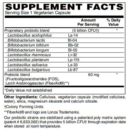 • The prebiotic blend consists of FOS (food source for probiotics), and FiberAid® arabinogalactans (patented prebiotic from Lonza® that helps support the growth of probiotics).