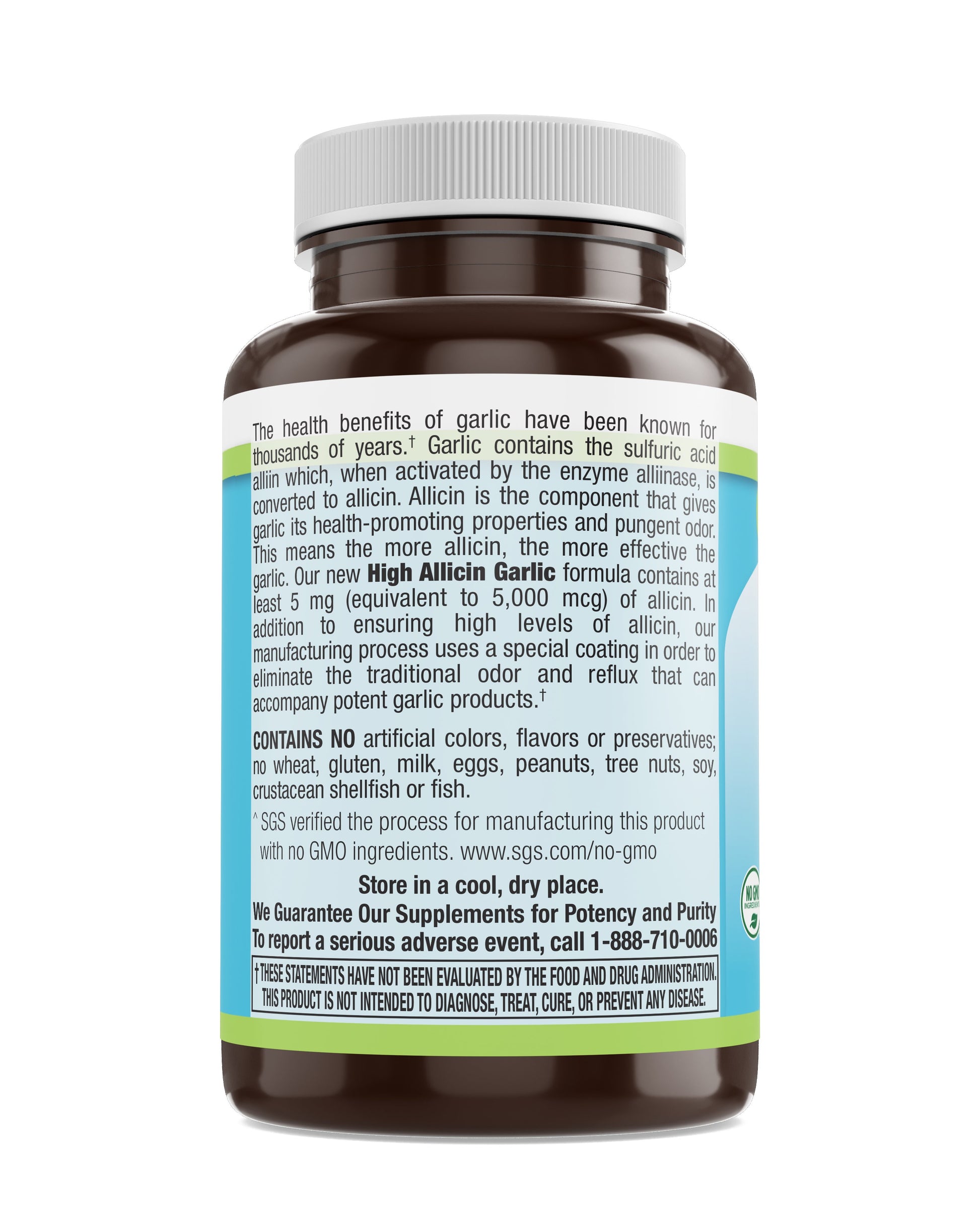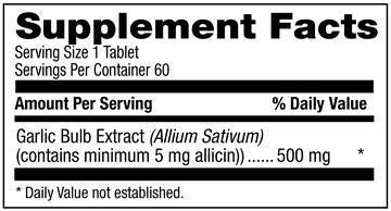 Minimum of 5 milligrams raw allicin per tablet. Allicin is the active ingredient in garlic that promotes healthy cholesterol and blood pressure.
